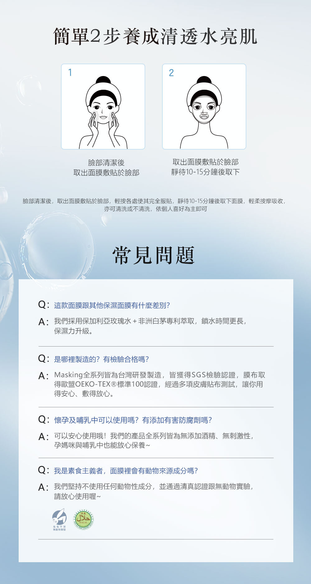 使用方式:臉部清潔後,取出面膜敷貼於臉部,輕按各處使其完全服貼,靜待10-15分鐘後取下面膜,輕柔按摩吸收,亦可清洗或不清洗,依個人喜好為主即可。使用頻率建議一週3-4次,欲加強者可天天使用。