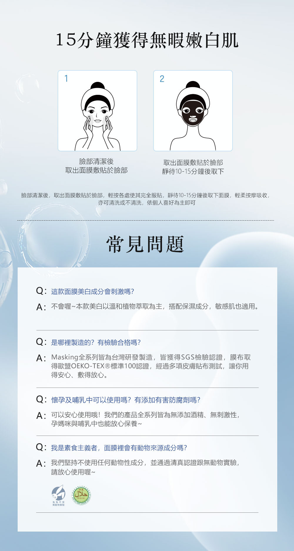 使用方式:臉部清潔後,取出面膜敷貼於臉部,輕按各處使其完全服貼,靜待10-15分鐘後取下面膜,輕柔按摩吸收,亦可清洗或不清洗,依個人喜好為主即可。使用頻率建議一週3-4次,欲加強者可天天使用。