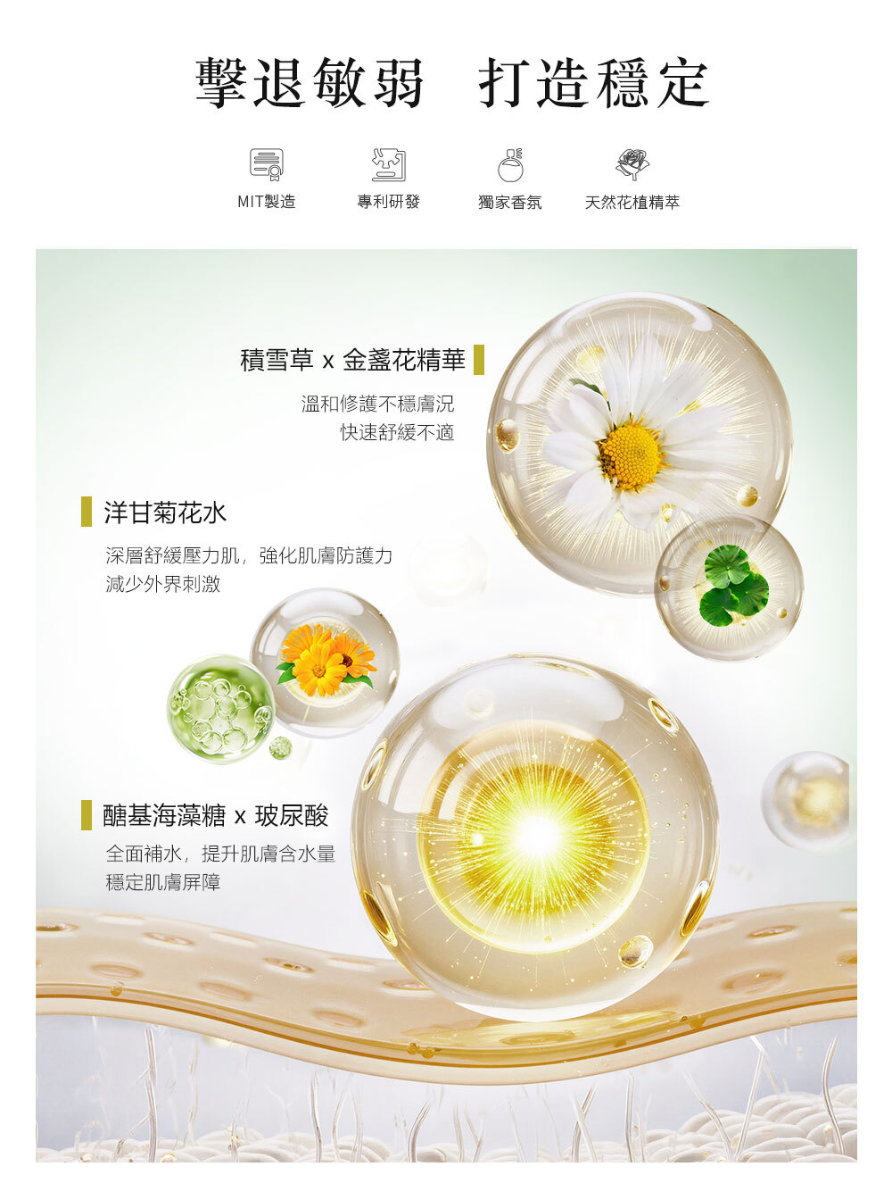 【洋甘菊花水】▸ 深層舒緩壓力肌,強化角質層保護力。