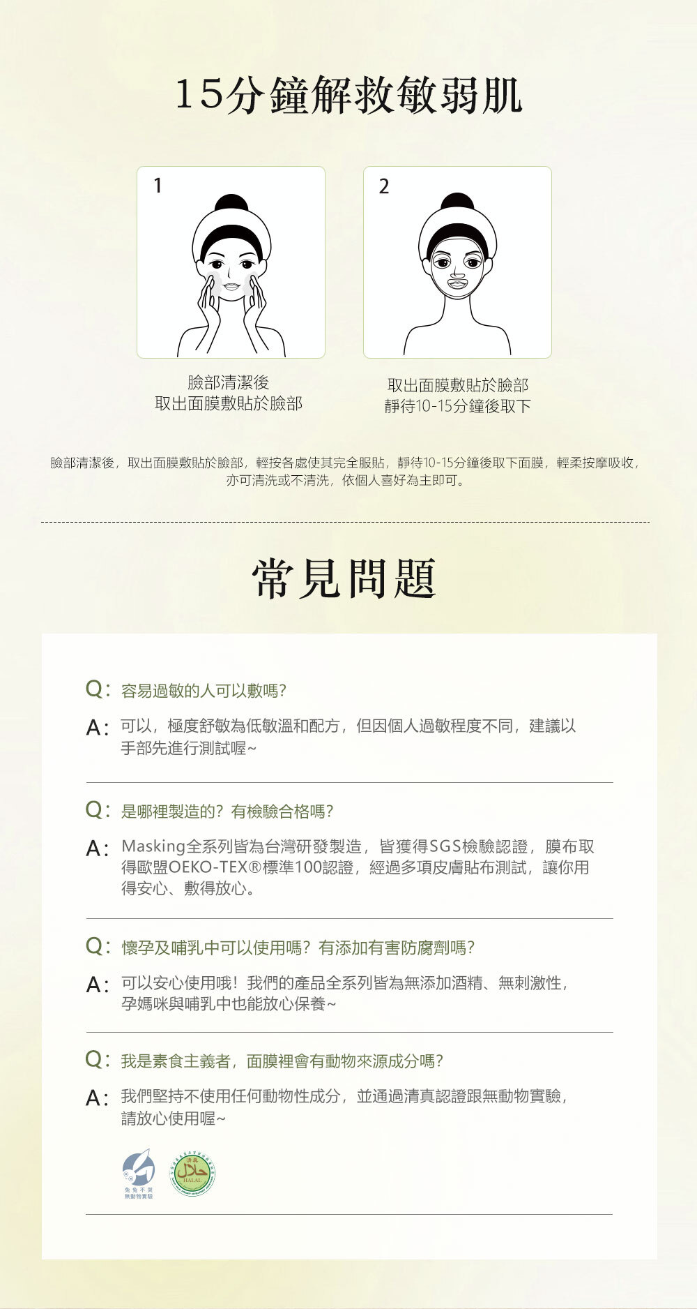 使用方式:臉部清潔後,取出面膜敷貼於臉部,輕按各處使其完全服貼,靜待10-15分鐘後取下面膜,輕柔按摩吸收,亦可清洗或不清洗,依個人喜好為主即可。使用頻率建議一週3-4次,欲加強者可天天使用。
