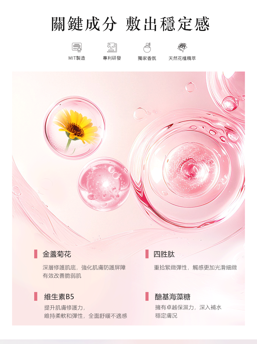 主要成分:金盞花水、維生素B5、緊實除皺四胜肽、玻尿酸