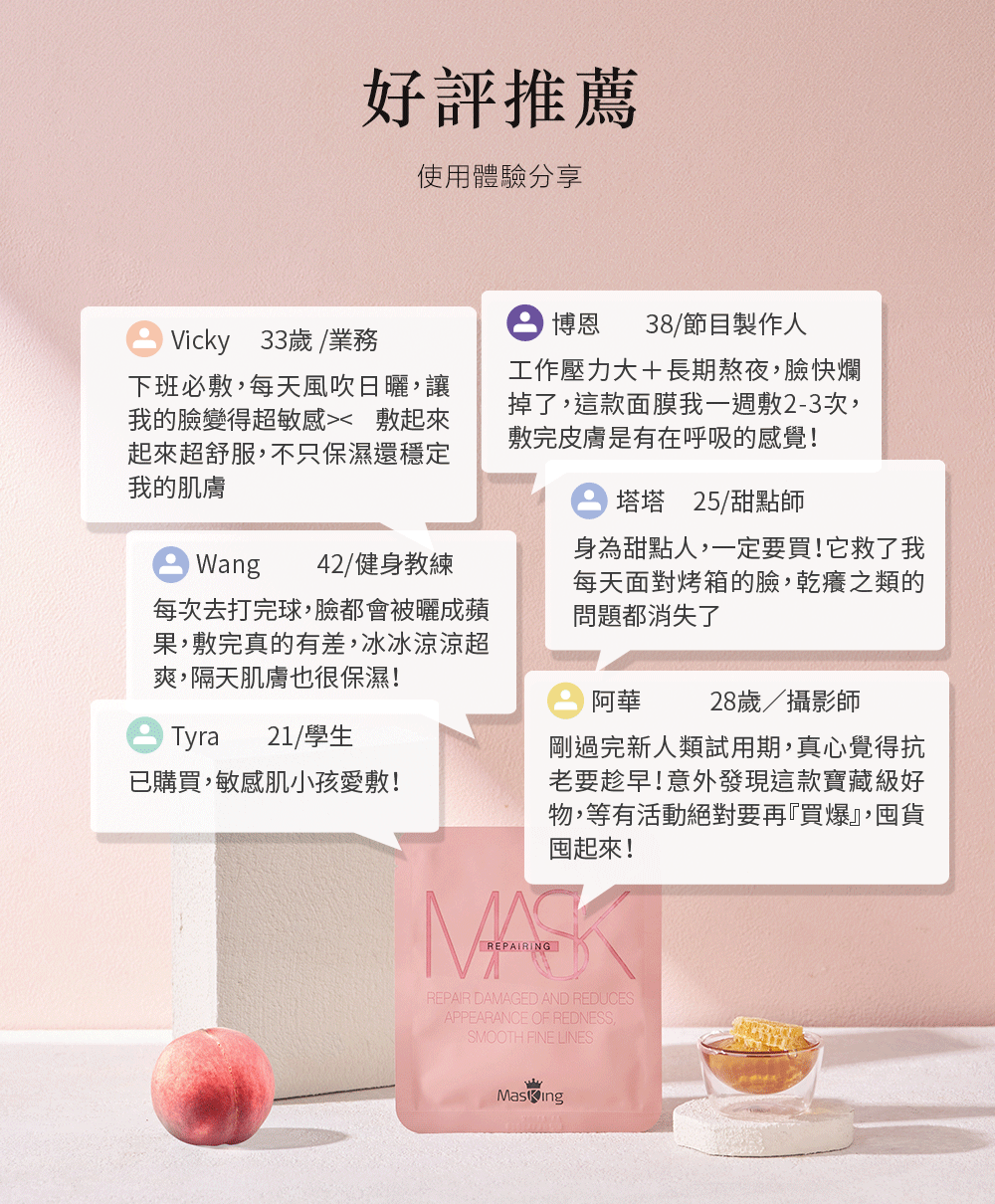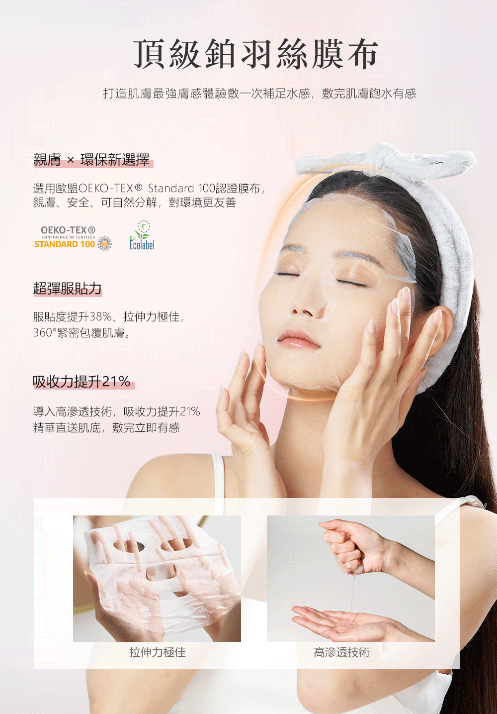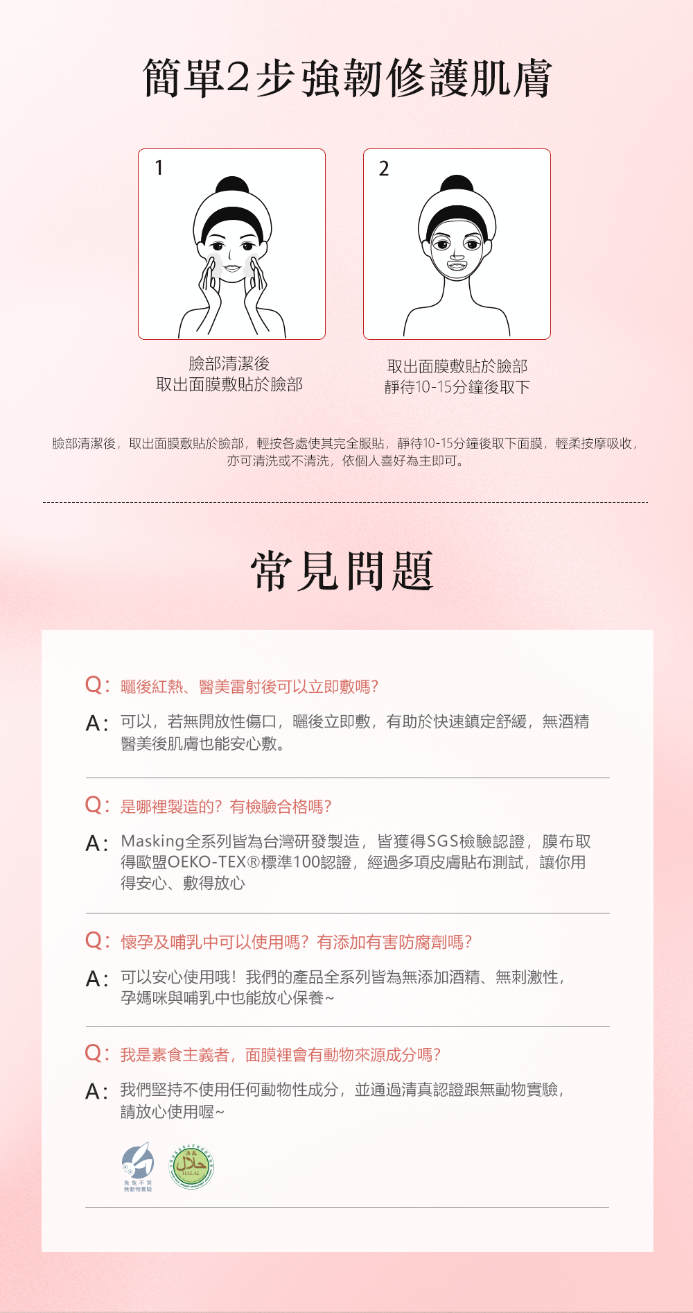 使用方式:臉部清潔後,取出面膜敷貼於臉部,輕按各處使其完全服貼,靜待10-15分鐘後取下面膜,輕柔按摩吸收,亦可清洗或不清洗,依個人喜好為主即可。使用頻率建議一週3-4次,欲加強者可天天使用。