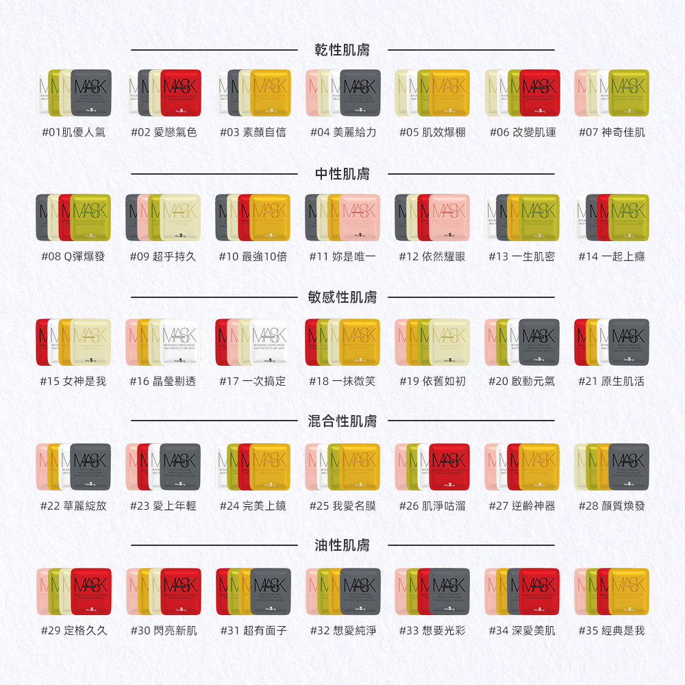 貼心提供 35 組不同套組選擇,依照膚況、需求與喜好自由搭配。