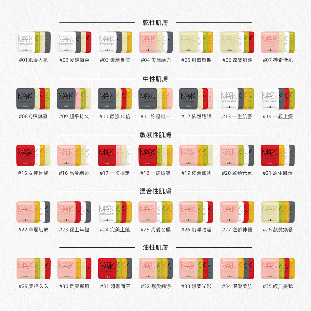 為了讓消費者獲得最專業的肌膚呵護,Masking 團隊打造專屬面膜肌膚檢測系統,提供 35 款不同套組,依照膚況需求與喜好自由搭配。循序漸進補給所需養分,讓肌膚天天由內而外綻放光采。