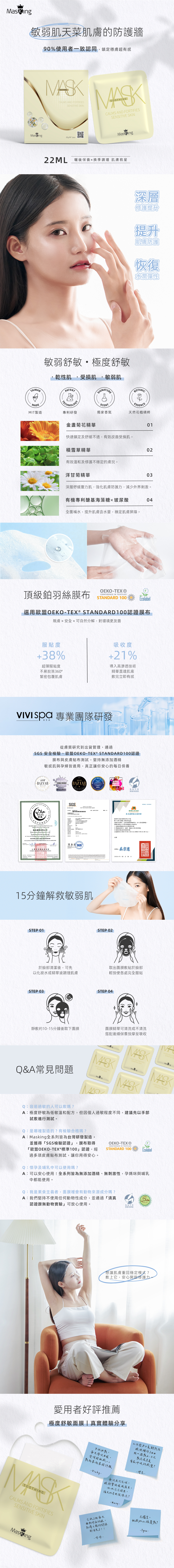 使用方式:臉部清潔後,取出面膜敷貼於臉部,輕按各處使其完全服貼,靜待10-15分鐘後取下面膜,輕柔按摩吸收,亦可清洗或不清洗,依個人喜好為主即可。使用頻率建議一週3-4次,欲加強者可天天使用。