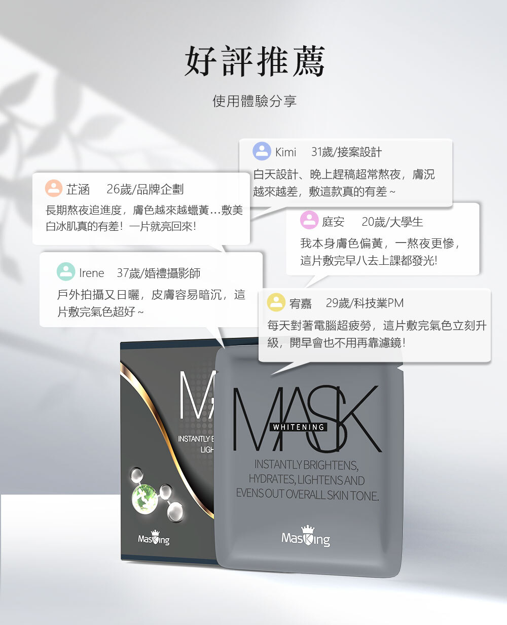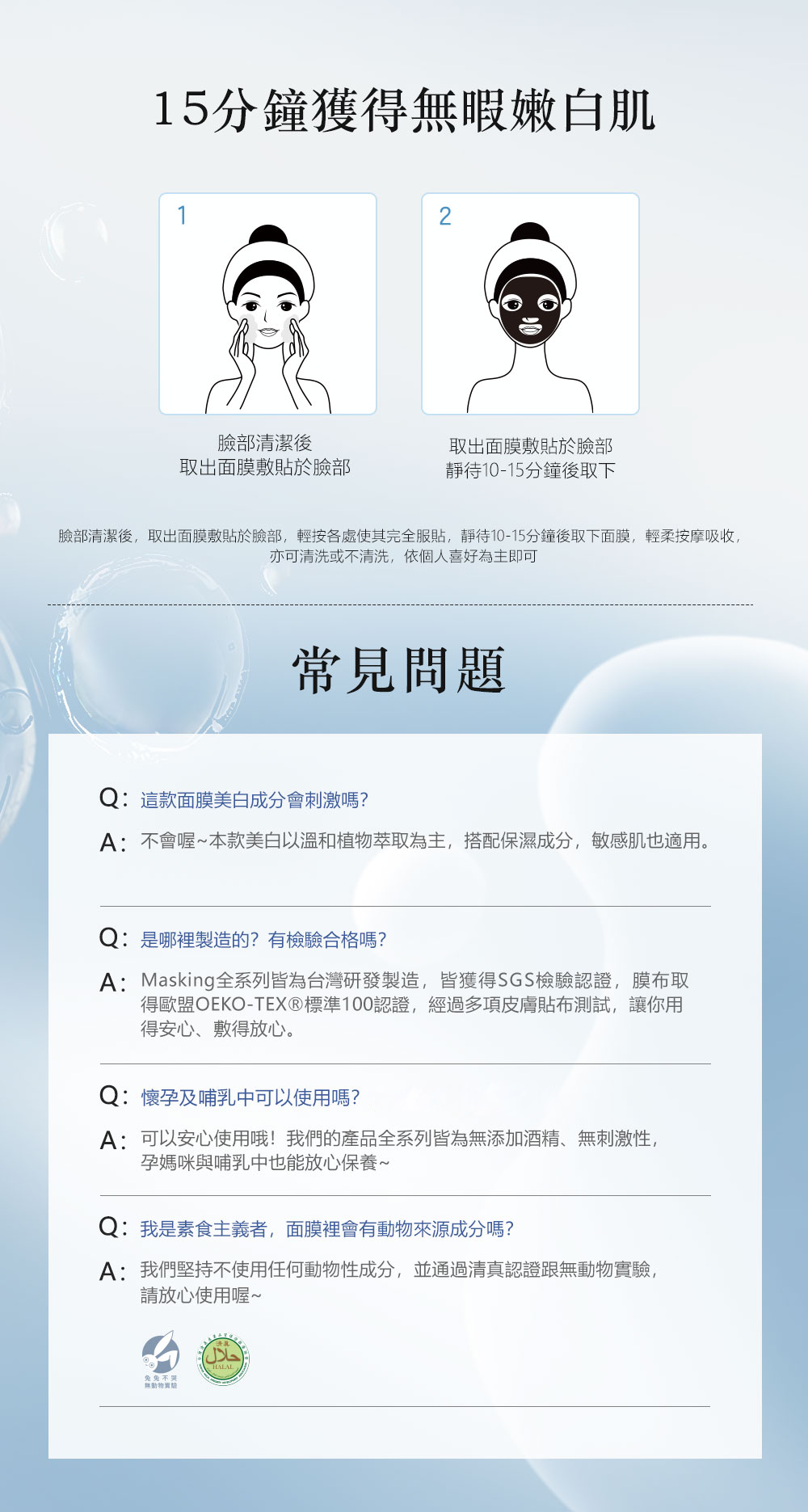 使用方式:臉部清潔後,取出面膜敷貼於臉部,輕按各處使其完全服貼,靜待10-15分鐘後取下面膜,輕柔按摩吸收,亦可清洗或不清洗,依個人喜好為主即可。使用頻率建議一週3-4次,欲加強者可天天使用。