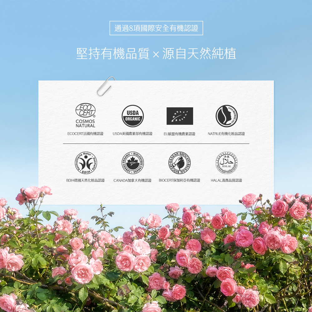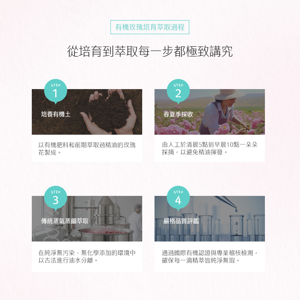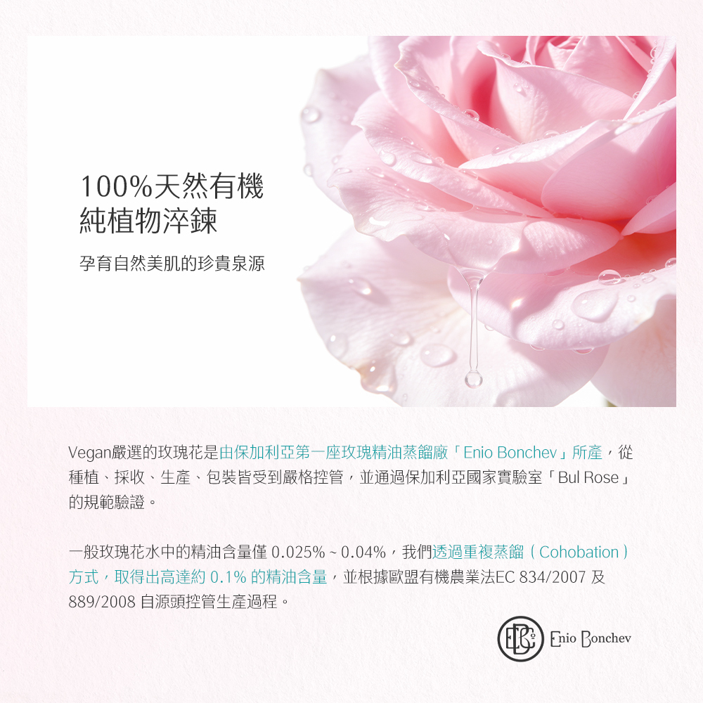 專為重視植萃成分與長期膚況穩定的熟齡肌所設,選用 100% 保加利亞有機玫瑰為核心,相較一般市售花水僅 0.025%–0.04% 的精油含量,本系列保留高達約0.1% 的精油含量,並以 100% 純植物萃取為基礎,讓純植保養成為每日安心依賴的生活儀式,展現成熟肌膚自然穩定的純淨之美。